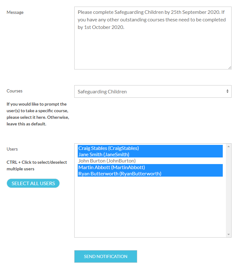 Note: you do not have to select a course for them to complete if you only want to send them a message (for example, a reminder to complete any outstanding courses before a deadline).