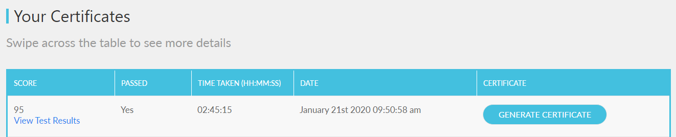 This table displays your score, pass status, time taken and date of completion. You can print or download your certificate using the Generate Certificate button.