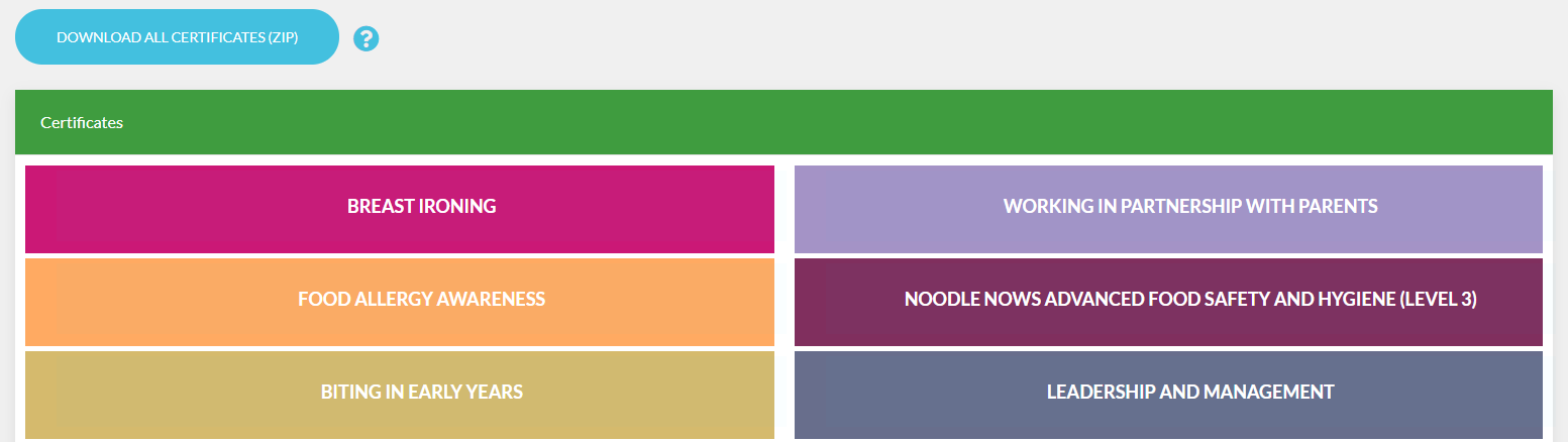 To download or print your certificates as a user, click Certificates at the top of the page. You will be presented with a list of all courses you have passed.